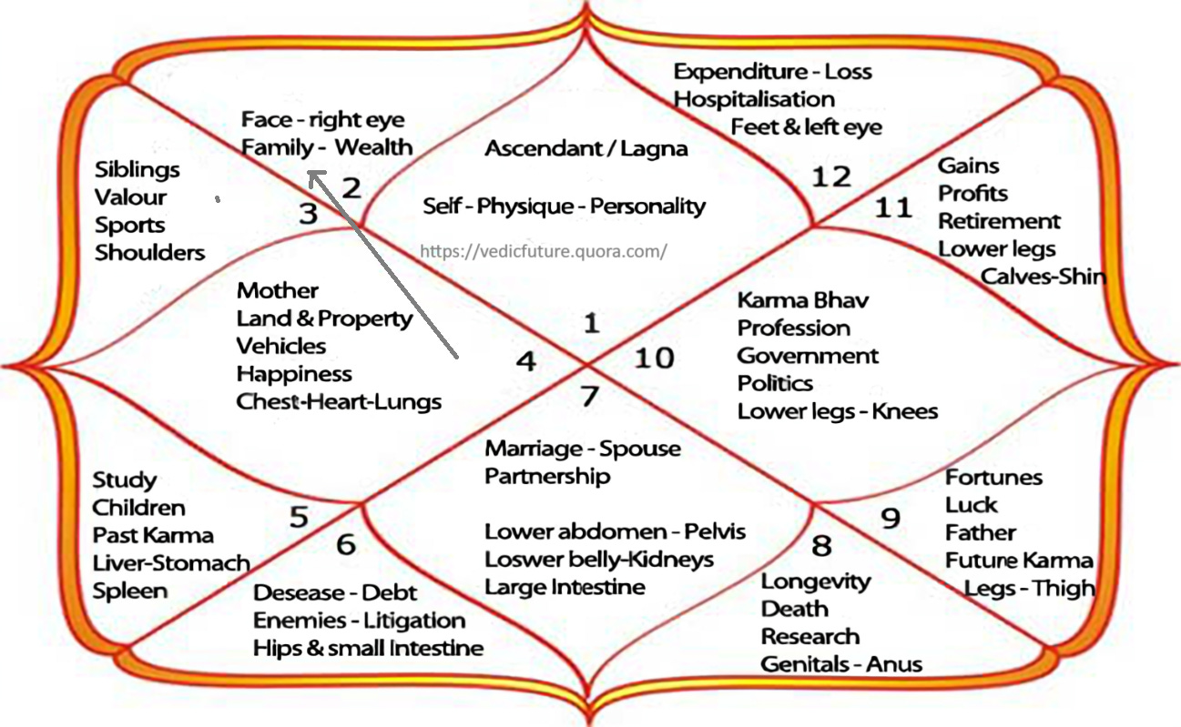 Second House (Dhana Bhav) represents Family, accumulated Wealth, speech, Family Lineage, Values, Assets etc. It is also known as the house of possessions. The reason for this is that the second house reflects all that we own, all our material goods, wealth, and possessions. But these possessions are not just tangible ones. The second house also caters to our feelings, emotions, our younger siblings and how we relate to them.